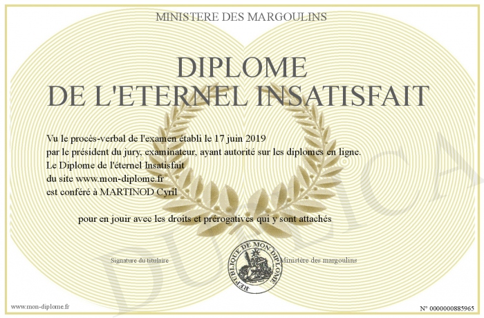 Envoyez par email votre Diplôme de l'éternel Insatisfait personalisé