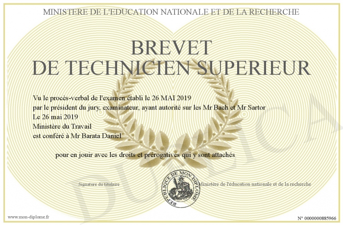Envoyez par email votre Brevet de Technicien Supérieur personalisé