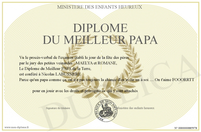 Envoyez par email votre Diplôme du Meilleur PAPA personalisé
