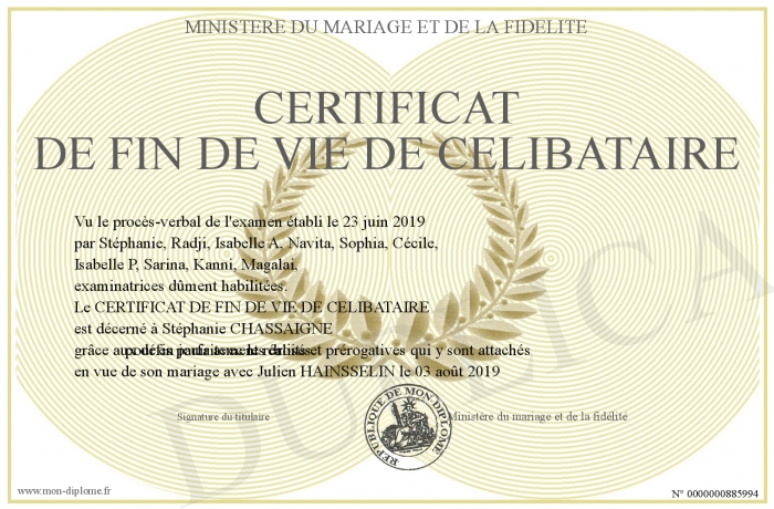 Envoyez par email votre Certificat de fin de vie de célibataire personalisé