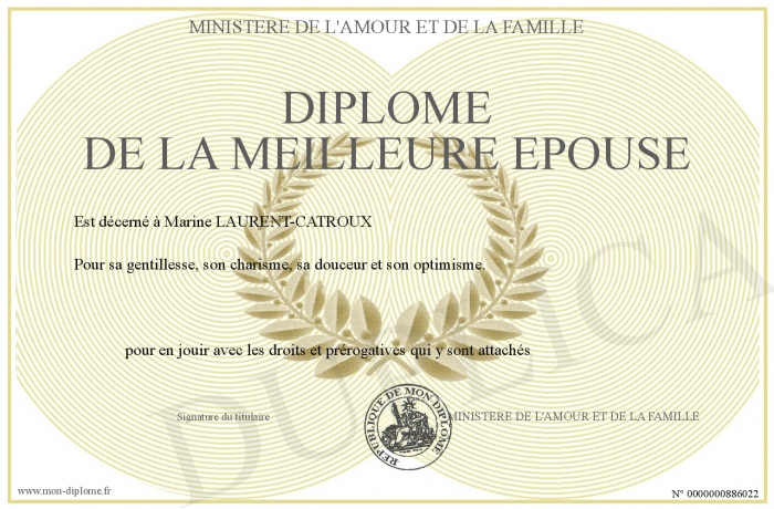 Envoyez par email votre DIPLOME DE LA MEILLEURE EPOUSE personalisé