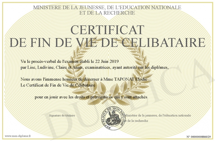 Envoyez par email votre Certificat de fin de vie de célibataire personalisé