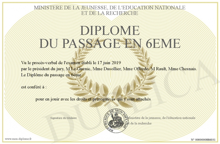 Envoyez par email votre Diplôme du Passage en 6ème personalisé
