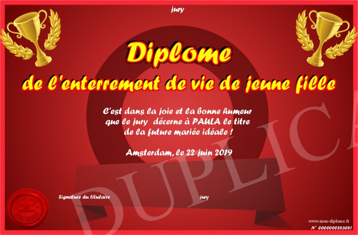 Envoyez par email votre Diplôme de l'enterrement de vie de jeune fille personalisé
