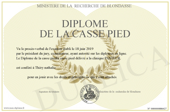 Envoyez par email votre Diplôme de la casse pied personalisé