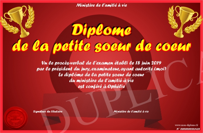 Envoyez par email votre Diplôme de la petite soeur de coeur personalisé