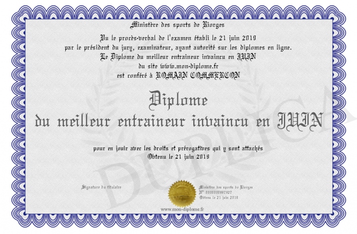 Envoyez par email votre Diplome du meilleur entraineur invaincu en JUIN personalisé