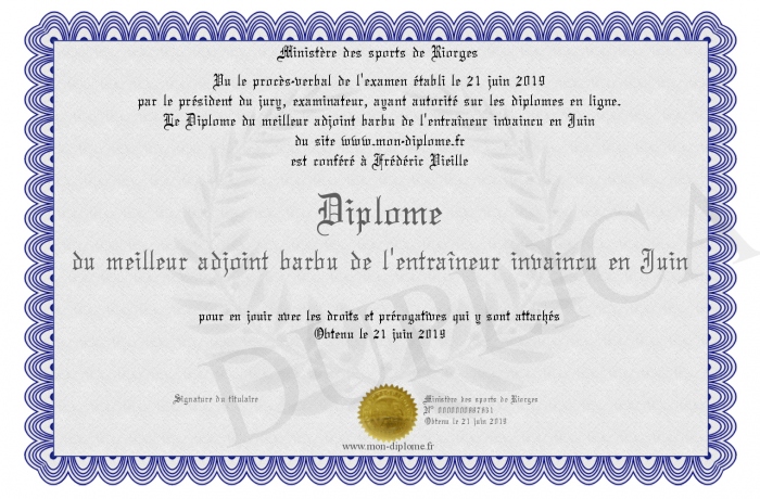 Envoyez par email votre Diplôme du meilleur adjoint barbu de l'entraîneur invaincu en Juin personalisé