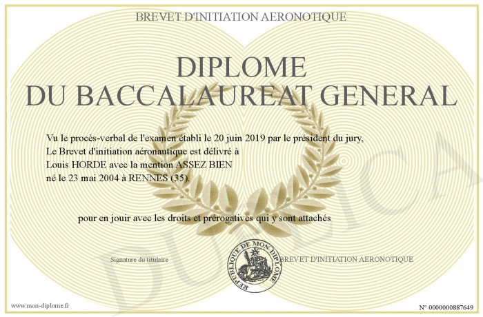 Envoyez par email votre Diplôme du baccalaureat général personalisé