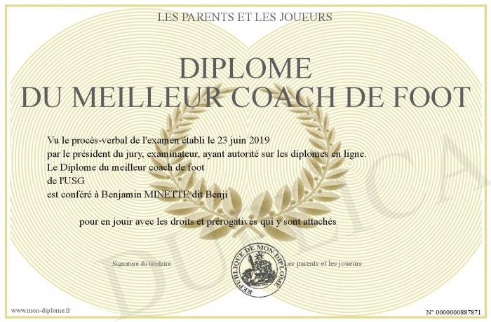 Envoyez par email votre Diplôme du meilleur coach de foot personalisé