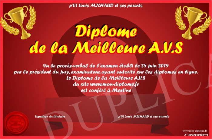 Envoyez par email votre Diplôme de la Meilleure A.V.S personalisé