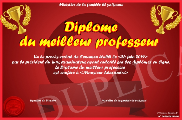 Envoyez par email votre Diplôme du meilleur professeur personalisé