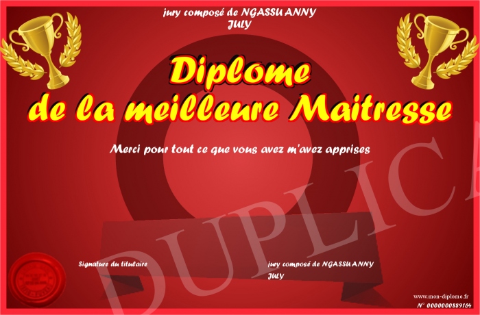 Envoyez par email votre Diplome de la meilleure Maitresse personalisé