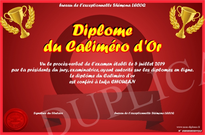 Envoyez par email votre Diplôme du Caliméro d'Or personalisé