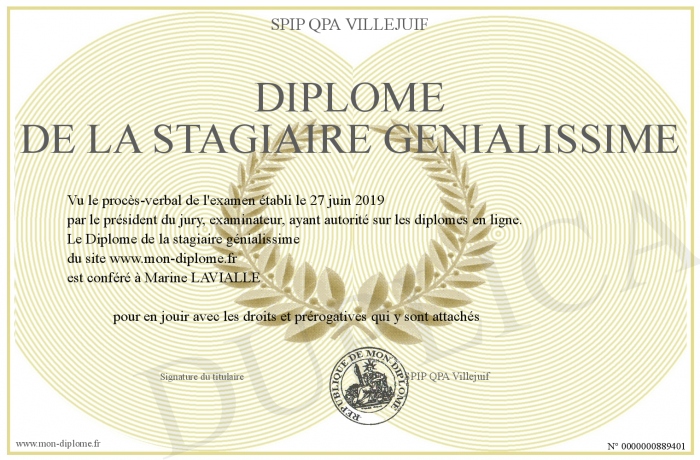 Envoyez par email votre Diplôme de la stagiaire génialissime personalisé