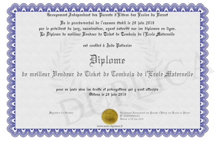 Envoyez par email votre Diplôme de meilleur Vendeur de Ticket de Tombola de l'Ecole Maternelle personalisé