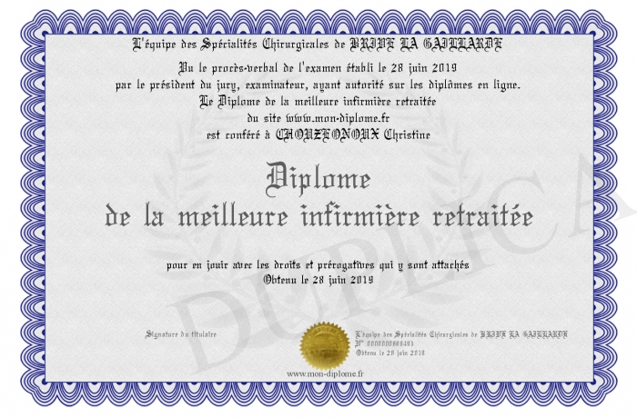 Envoyez par email votre Diplôme de la meilleure infirmière retraitée personalisé