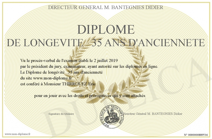 Envoyez par email votre Diplôme de longévité 35 ans d'ancienneté personalisé