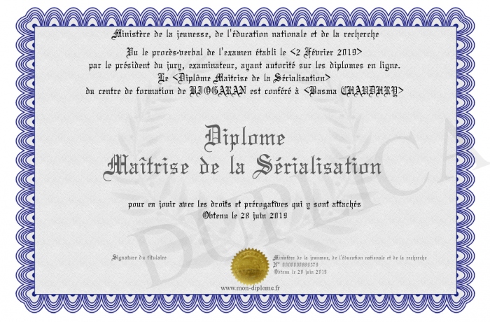 Envoyez par email votre Diplôme Maîtrise de la Sérialisation personalisé