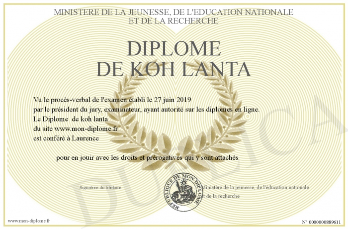 Envoyez par email votre Diplôme de koh lanta personalisé