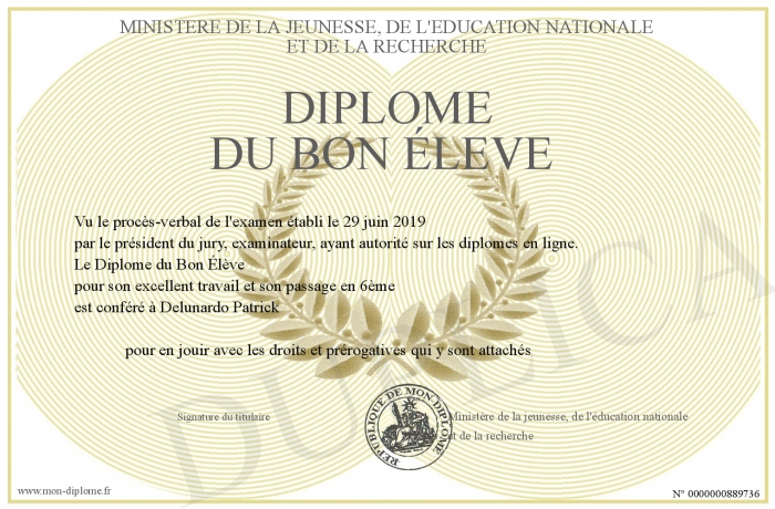 Envoyez par email votre Diplôme du Bon Élève personalisé