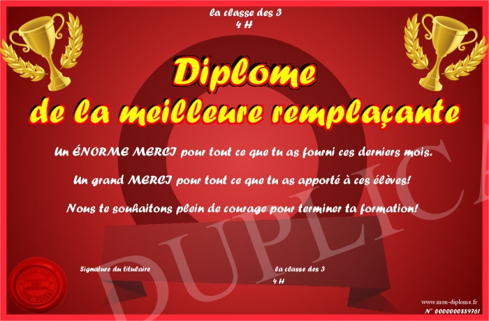 Envoyez par email votre Diplôme de la meilleure remplaçante personalisé