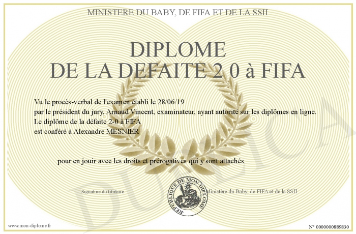 Envoyez par email votre diplôme de la défaite 2 0 à FIFA personalisé