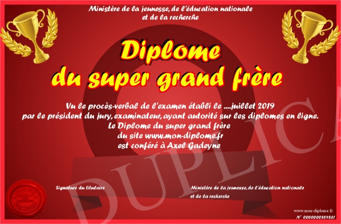 Envoyez par email votre Diplôme du super grand frère personalisé