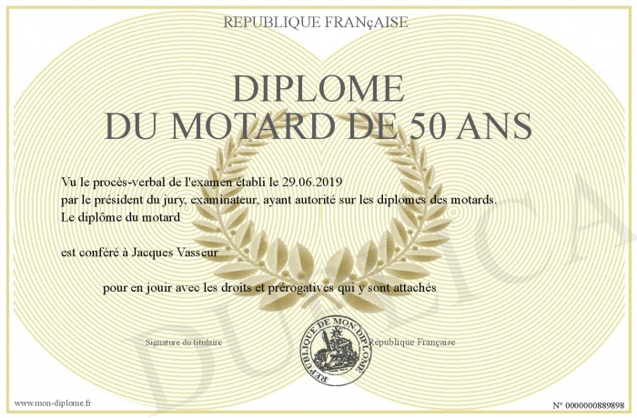 Envoyez par email votre Diplôme du Motard de 50 ans personalisé