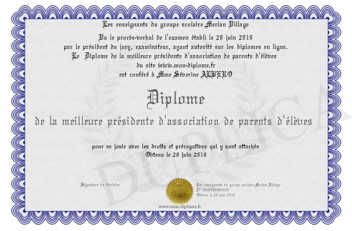 Envoyez par email votre Diplôme de la meilleure présidente d'association de parents d'élèves personalisé