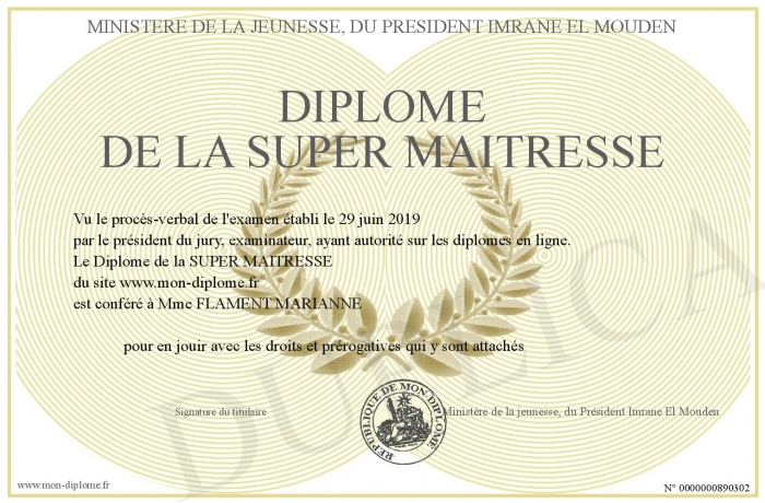 Envoyez par email votre Diplôme de la SUPER MAITRESSE personalisé