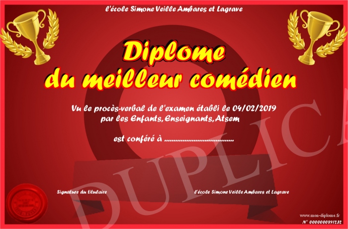 Envoyez par email votre Diplôme du meilleur comédien personalisé