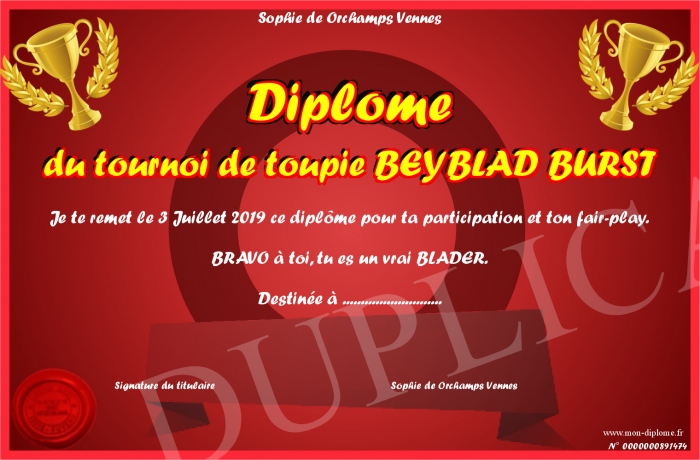 Envoyez par email votre Diplome du tournoi de toupie BEYBLAD BURST personalisé