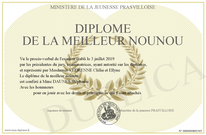 Envoyez par email votre Diplôme de la meilleur Nounou personalisé