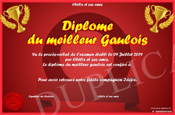 Envoyez par email votre Diplôme du meilleur Gaulois personalisé