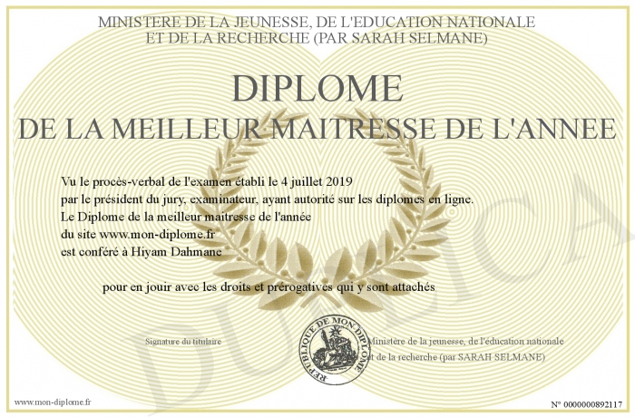 Envoyez par email votre Diplôme de la meilleur maitresse de l'année personalisé