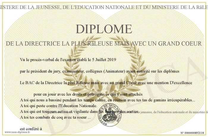 Envoyez par email votre Diplôme de la Directrice la plus Râleuse mais avec un grand Coeur personalisé