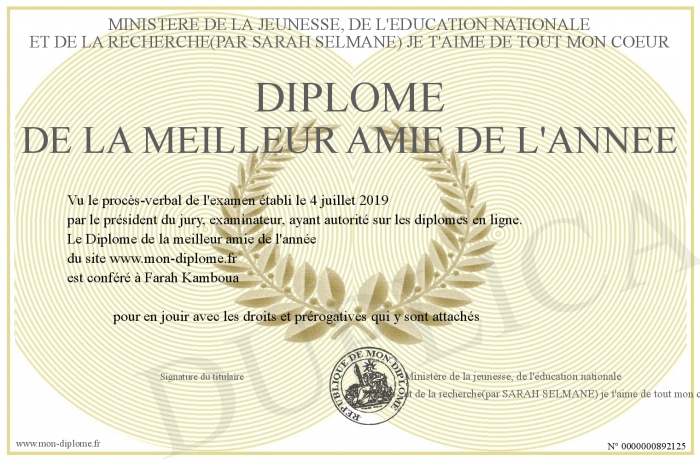 Envoyez par email votre Diplôme de la meilleur amie de l'année personalisé