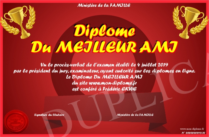 Envoyez par email votre Diplôme Du MEILLEUR AMI personalisé