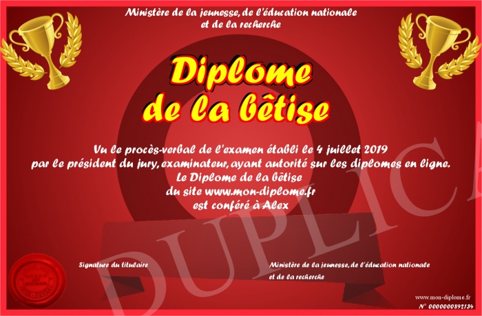 Envoyez par email votre Diplôme de la bêtise personalisé