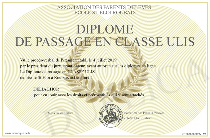 Envoyez par email votre Diplôme de passage en CLASSE ULIS personalisé