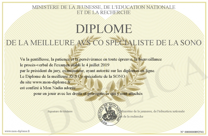 Envoyez par email votre Diplôme de la meilleure AVS Co spécialiste de la SONO personalisé