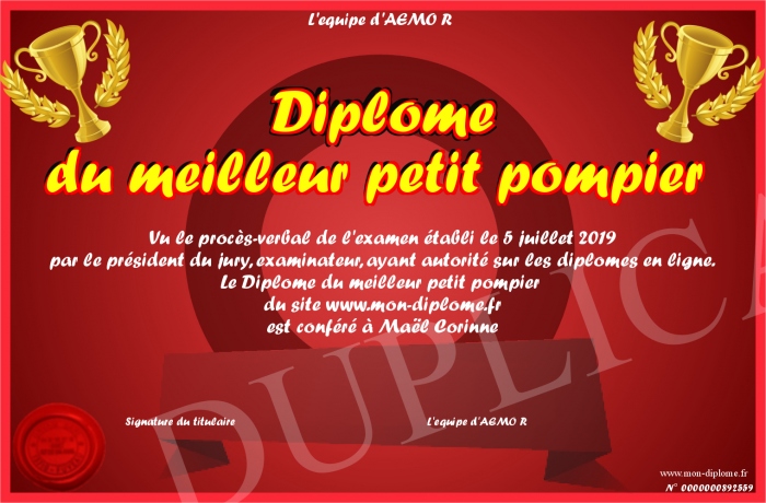 Envoyez par email votre Diplôme du meilleur petit pompier personalisé