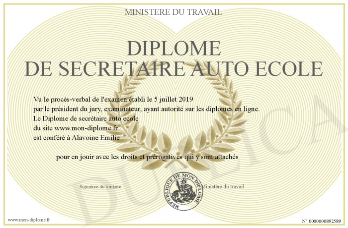 Envoyez par email votre Diplôme de secrétaire auto ecole personalisé
