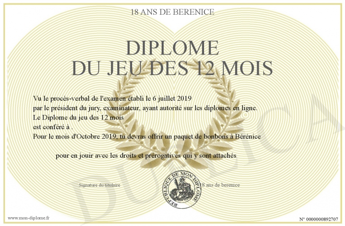 Envoyez par email votre Diplôme du jeu des 12 mois personalisé