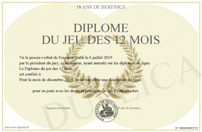 Envoyez par email votre Diplome du jeu des 12 mois personalisé