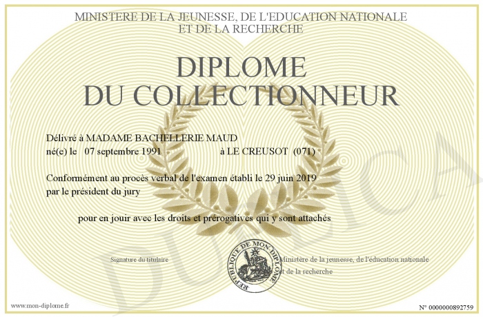Envoyez par email votre Diplôme du COLLECTIONNEUR personalisé