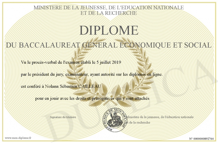 Envoyez par email votre Diplôme du baccalauréat général Économique et social personalisé