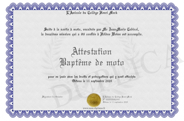 Envoyez par email votre Attestation Baptême de moto personalisé
