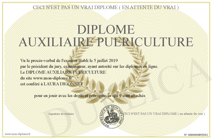 Envoyez par email votre DIPLOME AUXILIAIRE PUERICULTURE personalisé